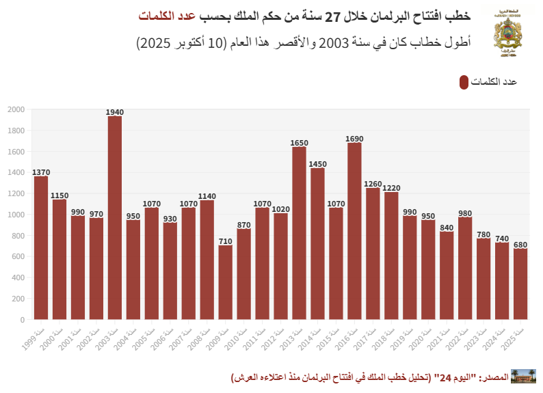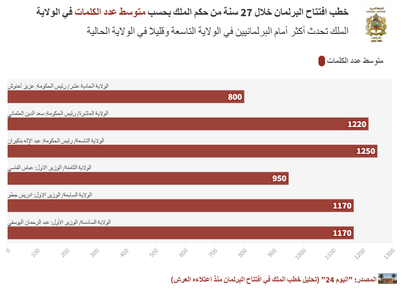 وتفاوت متوسط عدد كلمات الخطب الملكية على مر السنوات، وبلغ متوسطها في الولاية التشريعية الحالية 800 كلمة، وهو أصغر متوسط بالمقارنة مع كل الولايات السابقة، بينما سجلت الولاية التشريعية التاسعة، حين كان عبد الإله ابن كيران رئيسا للحكومة، أعلى متوسط بواقع 1250 كلمة، وسجل ثالث أعلى متوسط عدد كلمات الخطب الملكية في الولاية التشريعية الثامنة، وكان سعد الدين العثماني رئيسا للحكومة.