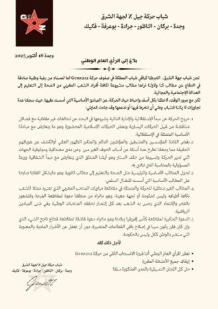 وشدد البيان الثاني على أن « مواقف الحركة ومبادئها ثابتة »، وأن أعضاء جهة الشرق « منخرطون بالكامل في الدفاع عن المطالب الاجتماعية العادلة للشعب المغربي، وعلى رأسها الحق في التعليم والصحة والعدالة المجالية ».