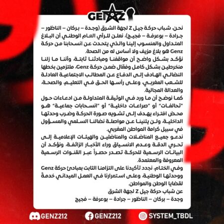 البلاغ الأول، الذي نُشر يوم 18 أكتوبر 2025، حمل توقيع « شباب حركة « جيل Z » لجهة الشرق » (وجدة – بركان – الناظور – جرادة – بوعرفة – فجيج – فكيك)، وأعلن ما وصفه بـ »الانسحاب الكامل » من حركة GenZ212، مبررًا ذلك بـ »ابتعاد الحركة عن مبادئها الأساسية »، و »سعي بعض قياداتها للتحالف مع تيارات غير منسجمة مع قيمها الأصلية »، إضافة إلى « تحويل النقاش من قضايا التعليم والصحة إلى مطالب ثانوية »، وفق تعبير البلاغ.