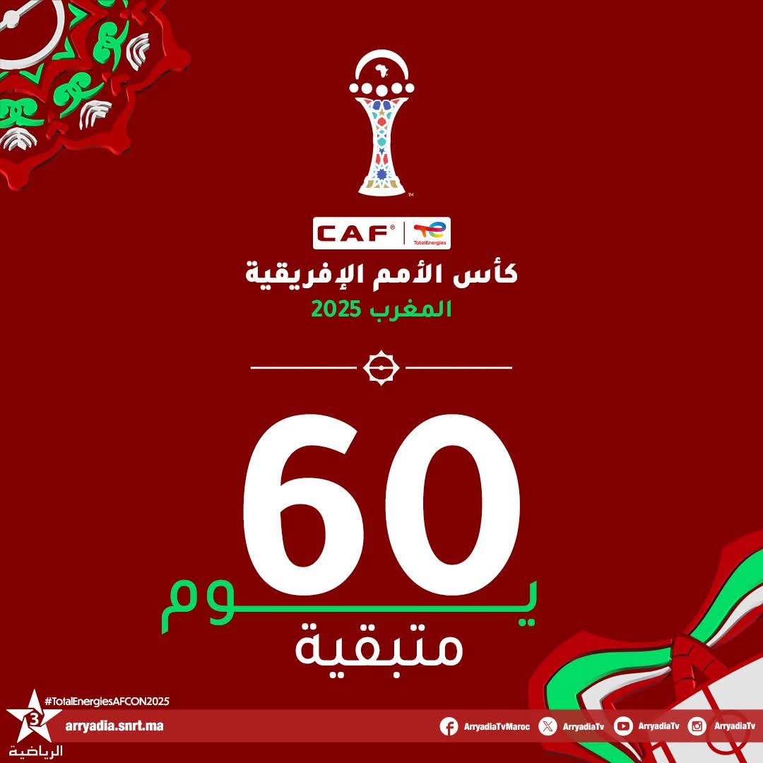 بدأ العد العكسي لاستضافة المغرب لنهائيات كأس الأمم الإفريقية، حيث ستنطلق المباريات يوم الأحد 21 دجنبر 2025، كما كان أعلن الاتحاد الإفريقي لكرة القدم، في اجتماع مكتبه التنفيذي الأخير في مراكش، ما يعني أنه تبقى 60 يوما على انطلاقة العرس الإفريقي.