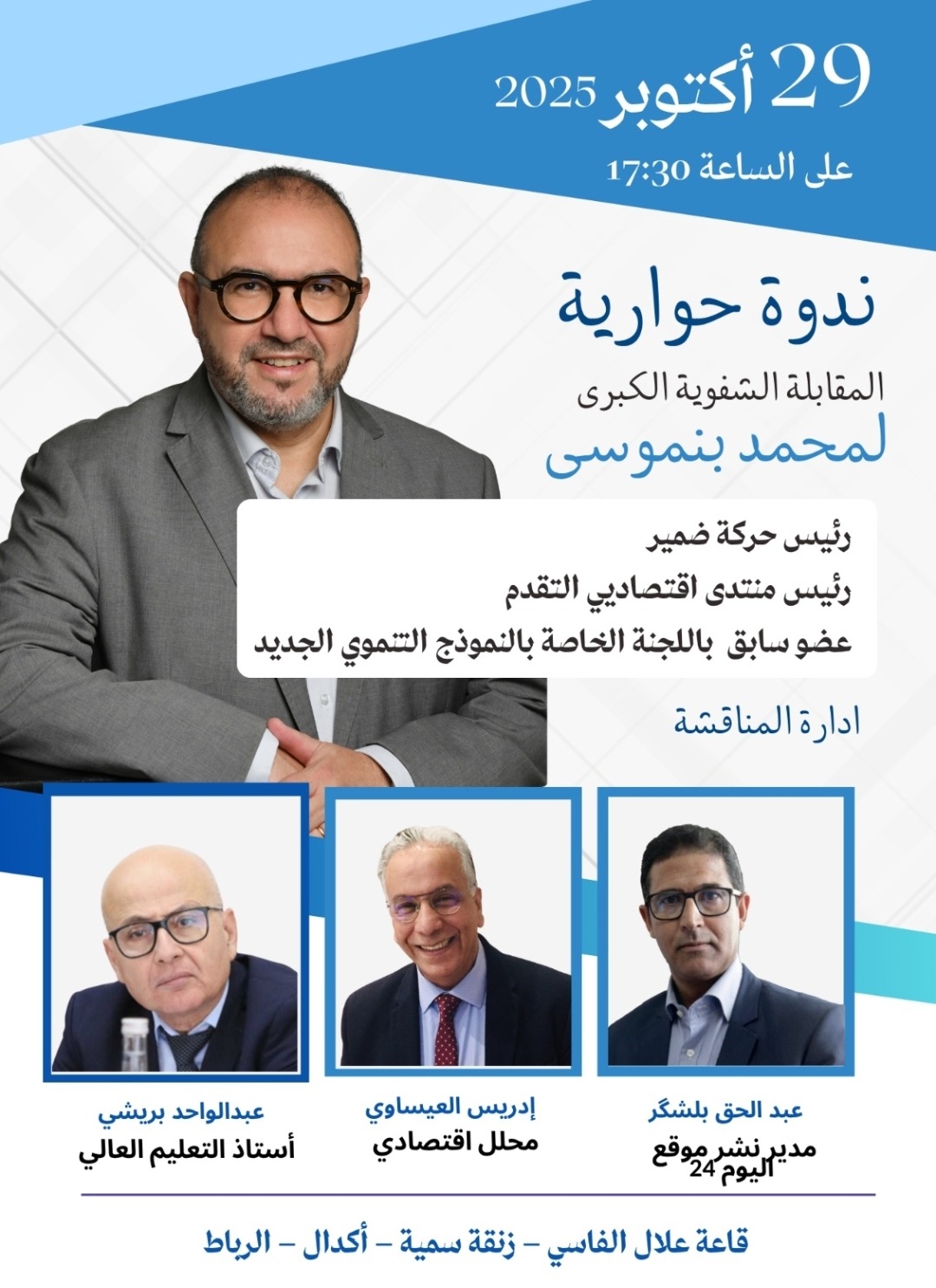 تحتضن قاعة علال الفاسي بحي أكدال في الرباط، اليوم الأربعاء 29 أكتوبر 2025 على الساعة الخامسة والنصف مساءً، ندوة حوارية كبرى مع الفاعل السياسي والمدني والاقتصادي محمد بنموسى، رئيس حركة ضمير ورئيس منتدى اقتصاديي التقدم والاشتراكية، وعضو سابق باللجنة الخاصة بالنموذج التنموي الجديد.
