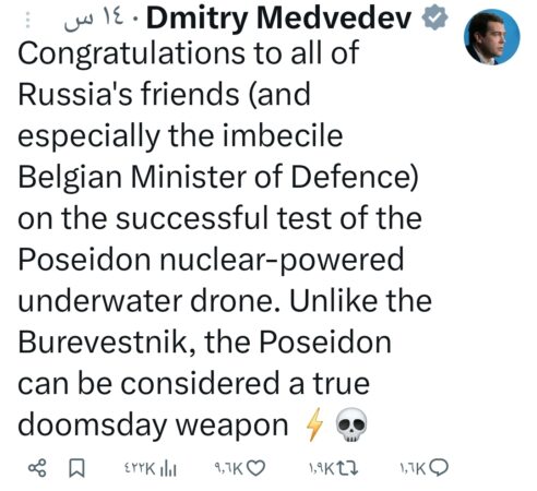 بعد إعلان الرئيس الروسي فلاديمير بوتين عن نجاح اختبار الطوربيد النووي « بوسيدون »، وصف نائب رئيس مجلس الأمن الروسي ديميتري ميدفيديف السلاح الجديد بأنه يمكن اعتباره « سلاح يوم القيامة الحقيقي »، في تصريح مثير للجدل نشره على حسابه الرسمي بمنصة « إكس » (تويتر سابقاً).