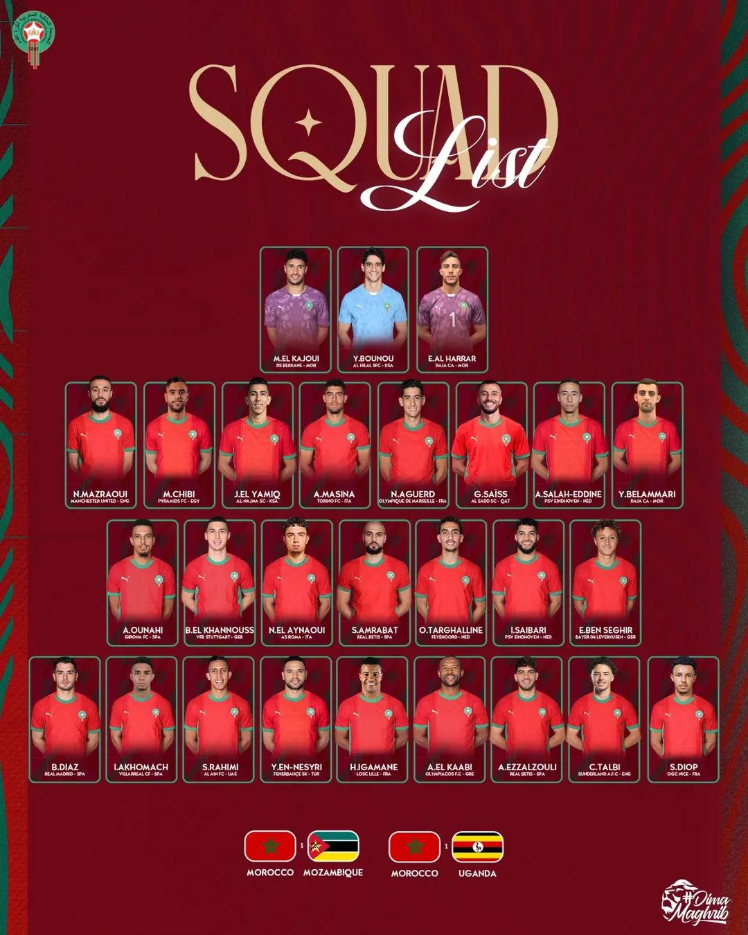 ياسين بونو – منير المحمدي – المهدي الحرار – نصير مزراوي – محمد الشيبي – جواد الياميق – آدم ماسينا – نايف أكرد – رومان سايس – أنس صلاح الدين – يوسف بلعمري – عز الدين أوناحي – بلال الخنوس – نايل العيناوي – سفيان أمرابط – أسامة تيرغالين – اسماعيل الصيباري – إلياس بن الصغير – ابراهيم دياز – إلياس أخوماش – سفيان رحيمي – يوسف النصيري – حمزة ايغمان – أيوب الكعبي – عبد الصمد الزلزولي – شمس الدين الطالبي – سفيان ديوب